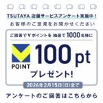 TSUTAYA店舗アンケート実施中! アンケートにご回答の上、V会員番号をご入力いただいた方の中から抽選で 1,000名様にVポイン...