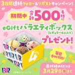 サーティワンアイスクリーム バラエティボックス レギュラー4コ入り eGiftがフォロー&リポストで合計500名に当たる。