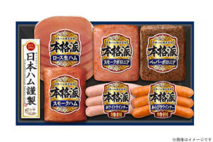 スモークハム152g、ロース生ハム27g、スモークボロニア105g、ペッパーボロニア105g、特撰あらびきウインナー66g、特撰ホワイトウインナー66gの6点を詰め合わせた本格派ギフトセット。