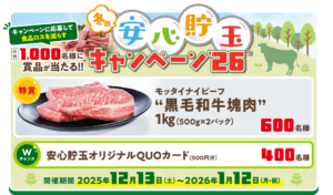 J-NETの安心貯玉.comで『冬の安心貯玉キャンペーン’26』が開催中です。アンケートに答えて応募すると、オリジナルQUOカードなどが抽選で合計1,000名に当たります。