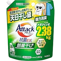 Amazonにて「【大容量】アタック抗菌EX 部屋干し用 洗濯洗剤 液体 じめじめ密集干しでも強力消臭 つめかえ用 2380g」がタイムセール特価979円で販売中。定期おトク便ならさらにお買い得です。