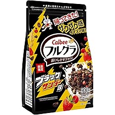 ブラックなグラノーラにココアクッキーをトッピングしたブラックサンダー味のカルビーフルグラ。フルグラとブラックサンダー両方のザクザク食感とおいしさが楽しめます。