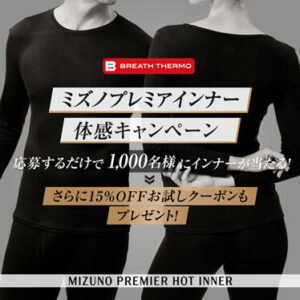 ミズノ公式オンラインの特設ページで「ミズノプレミアインナー体感キャンペーン」が開催中です。CLUB MIZUNO会員に会員登録して応募すると、ミズノプレミアホットインナー ブレスサーモが抽選で合計1,000名に当たります。