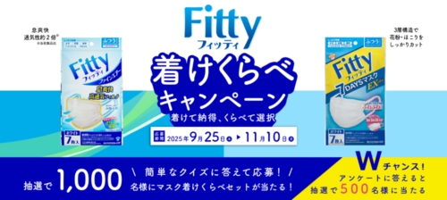 簡単なクイズに答えて応募すると「フィッティ マスク着けくらべセット」が抽選で1,000名に当たります。