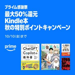 Amazon.co.jpのKindleストアでは「Kindle本 プライム感謝祭 秋の特別ポイントキャンペーン」が開催中です。今なら対象の電子書籍が最大50%ポイント還元になります。
