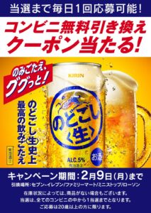 キリン特設サイトにて「のどごし<生> コンビニ無料引き換えクーポンが当たる!キャンペーン」を実施中です。LINEアカウントでログインして応募すると、キリン のどごしのコンビニ引換クーポンが抽選で180,000名に当たります。