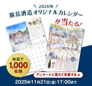 霧島酒造公式サイトの特設ページで「オリジナルカレンダープレゼント! キャンペーン」が開催中です。アンケートに答えて応募すると、「2026年オリジナルカレンダー」が抽選で1,000名に当たります。