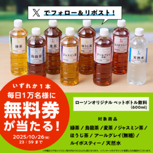 ローソン店頭で使える「ローソンオリジナルペットボトル飲料」の無料引換券が抽選で毎日1万名・合計5万名に当たります。