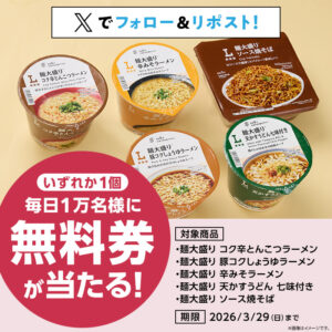 ローソン研究所では『3月25日(水)スタート♪毎日1万名様に抽選で「対象のローソンオリジナル麺大盛りカップ麺」無料券をプレゼント!』キャンペーンが開催中です。
