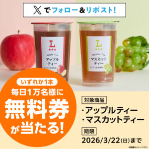 ローソン研究所では『3月18日(水)スタート♪毎日1万名様に抽選で「ローソンオリジナルアップルティー・マスカットティー」無料券をプレゼント!』キャンペーンが開催中です。