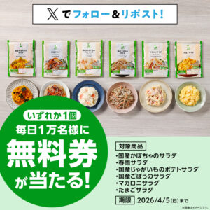 ローソン オリジナルパウチサラダ いずれか1個 無料引換券がフォロー&リポストで合計5万名にその場で当たる。