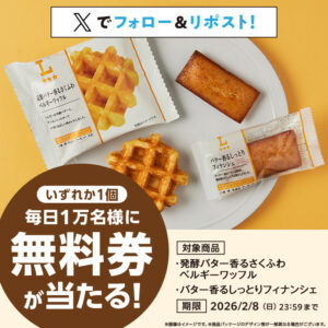 ローソン研究所では『2月4日(水)スタート♪毎日1万名様に抽選で「発酵バター香るさくふわベルギーワッフル・バター香るしっとりフィナンシェ」無料券をプレゼント!』キャンペーンが開催中です。