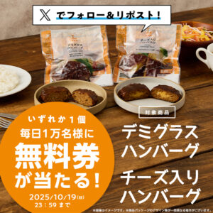 ローソン店頭で使える「デミグラスハンバーグ・チーズ入りハンバーグ」いずれか1個無料引換券が抽選で毎日1万名・合計5万名に当たります。