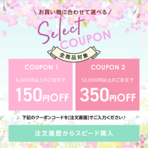 全商品対象の選べる割引クーポンが配信中。クーポンは一人各1回のみ有効です。