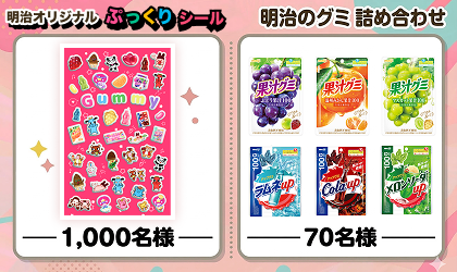 明治IDでログインしアンケートに答えて応募すると、明治オリジナルぷっくりシールなどが抽選で合計1,070名に当たります。
