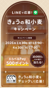 PascoのLINE公式アカウントで「LINEで応募!きょうの和小麦キャンペーン」が開催中です。友だち追加して応募すると、えらべるPay500ポイントが抽選で10,000名に当たります。