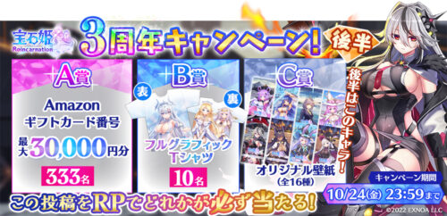 スマホゲーム「宝石姫 Reincarnation」で『#ジュエプリ 3周年キャンペーン』が開催中です。Amazonギフト券などが抽選で合計343名に当たります。