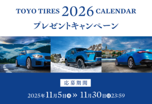 TOYO TIRE公式サイトの特設ページで「2026年度 TOYO TIRES企業カレンダープレゼントキャンペーン」を実施中です。フォームに必要事項を入力して応募すると、「2026 TOYO TIRES オリジナルカレンダー」が抽選で1,500名に当たります。