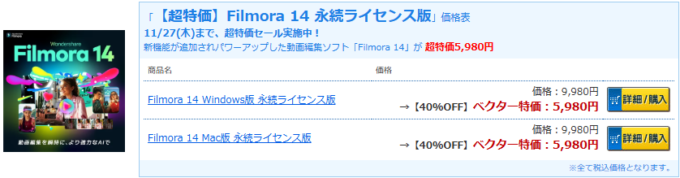 ダウンロードソフトウェア販売のベクターPCショップにて「Filmora 14 Windows版 or Mac版 永続ライセンス版」が超特価5,980円で販売中です。