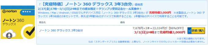 ベクターPCショップにて「ノートン 360 デラックス 3年3台分」が86%OFFの限定特価3,000円で販売中です。3月1日(日)まで。